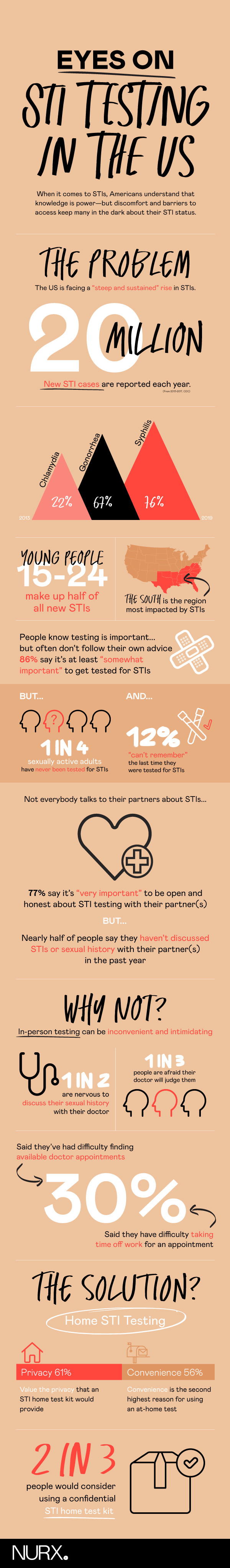 Sexually transmitted infections (STIs) are super-common: One in two sexually active people will contract an STI by age 25. But many people who are at risk don’t get tested as much as they should, or at all, which means they don’t know their status and may be going untreated and infecting their partners. To understand what’s up with people not getting tested, we partnered with DKC Analytics and surveyed 1000 Americans about their attitudes and actions when it comes to STIs.